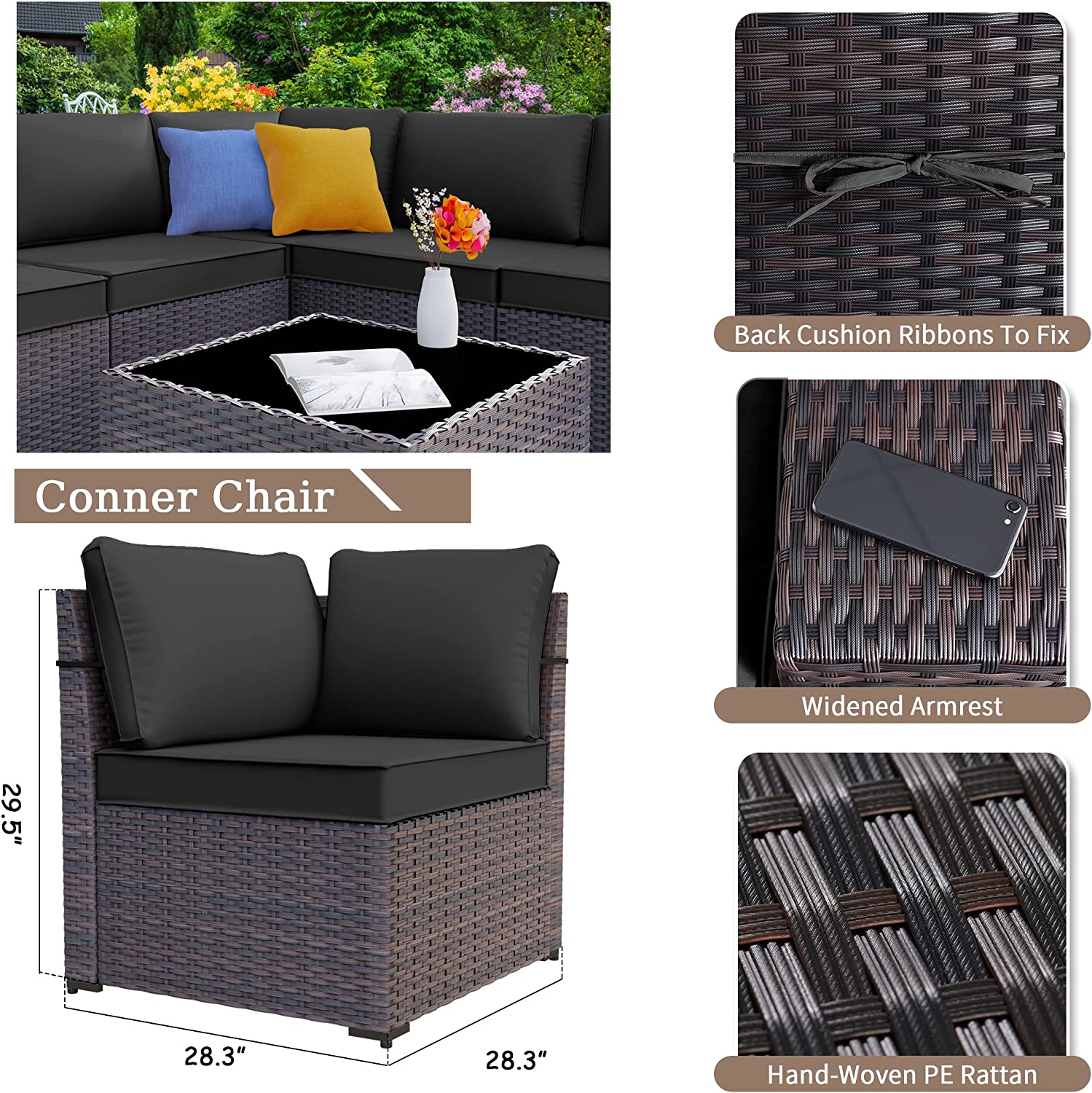 PATIO FURNITURE SET: Delnavik 7-piece wicker patio furniture set is easy to install and made of high-quality synthetic handmade rattan. The set includes 2 middle sofas, 2 armrest sofas with cushions, 1 corner sofa, 1 fire pit table, and 1 tempered glass coffee table. And all necessary tools and detailed instructions are in the box