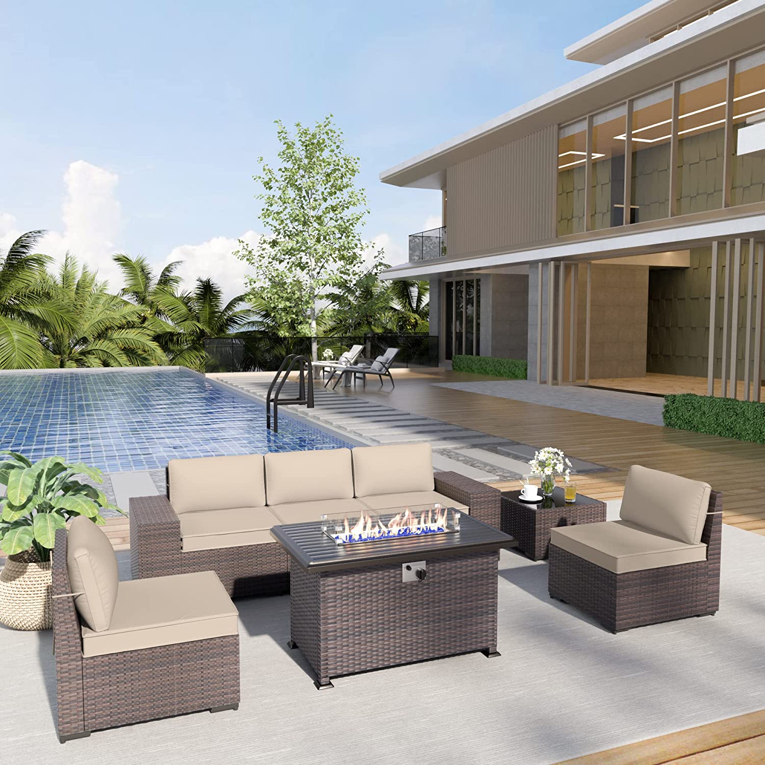 Kevarada Patio Furniture Sectional Sofa Set 7-Pieces PE Rattan Patio Conversation Set w/43in Gas Fire Pit Table, Outdoor Furniture with 55000 BTU Propane Fire Pit, Sand