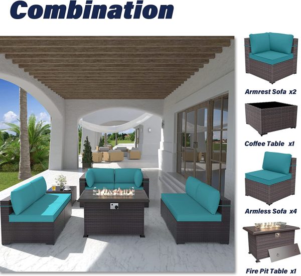 Kevarada Patio Furniture Set with Fire Pit Table 8 PCS Outdoor Sectional Furniture Outdoor Rattan Patio Conversation Sets with 43in 55,000 BTU Propane Gas Fire Pit Table Glass Table, Blue